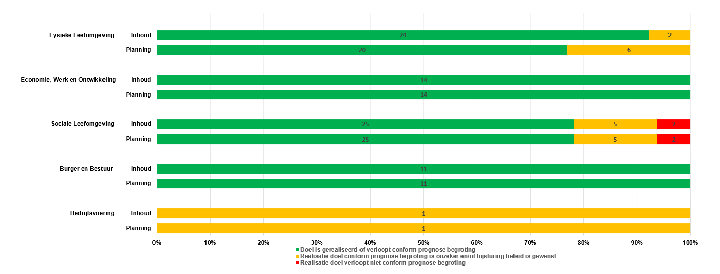 - Groen: doel is gerealiseerd of verloopt conform prognose begroting;