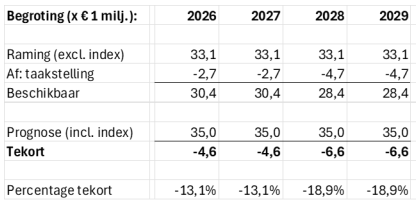 Hiermee komt het begrotingssaldo vanaf 2030 uit op een tekort van € 1,42 miljoen in 2030 oplopend naar een tekort van € 2,22 miljoen in 2034.