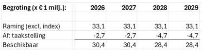 Specifiek is in het huidige meerjarenperspectief voor de jaren 2026 en 2027 afgerond € 30,4 miljoen en voor de jaren 2028 en 2029 is € 28,4 miljoen begroot. Deze bedragen zijn als volgt opgebouwd:
